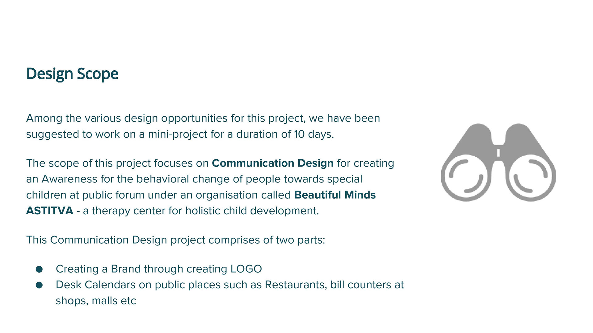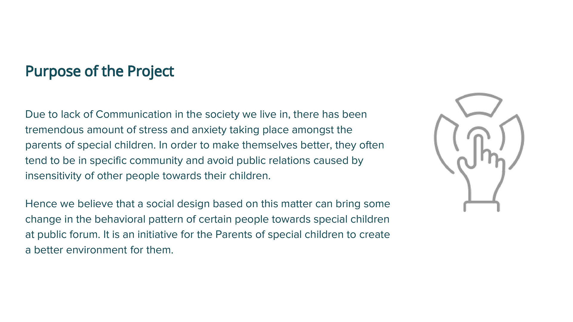 A social design to bring some change in the behavioral pattern of certain people towards special children at public forum. It is an initiative for the Parents of special children to create a better environment for them.